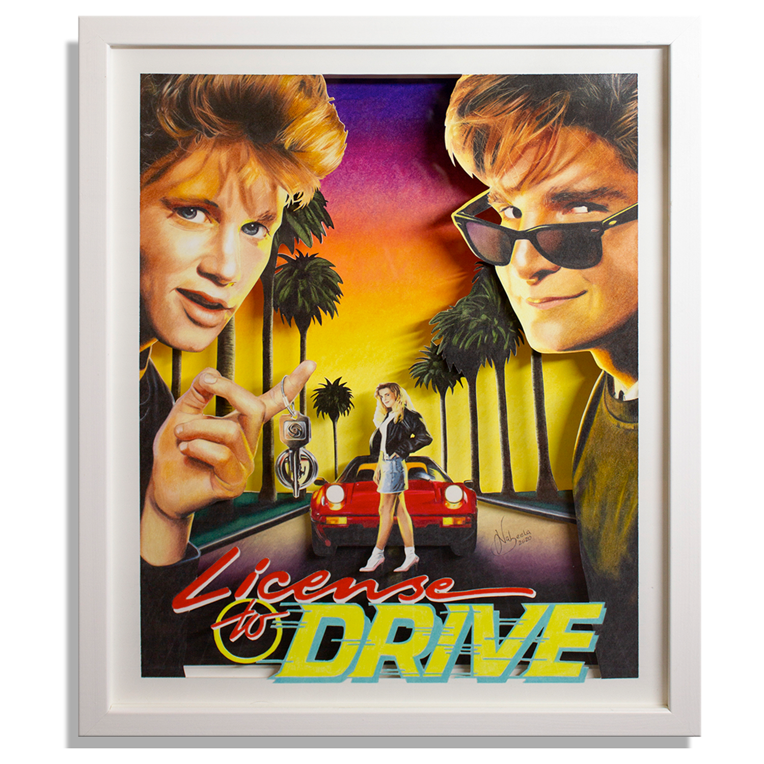 A 3D layered coloured pencil drawing of the CLASSIC MOVIE License to Drive featuring Corey Haim, Heather Graham and Corey Feldman. It took OVER 100+ hours to create! This style of art allows light to cast shadows creating depth bringing the movie poster to life.